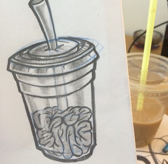 Personal design "Coffee Brainz" sketch to fully rendered image. Vector line work done in adobe illustrator with raster color work done in Photoshop using a Wacom intuos 5.